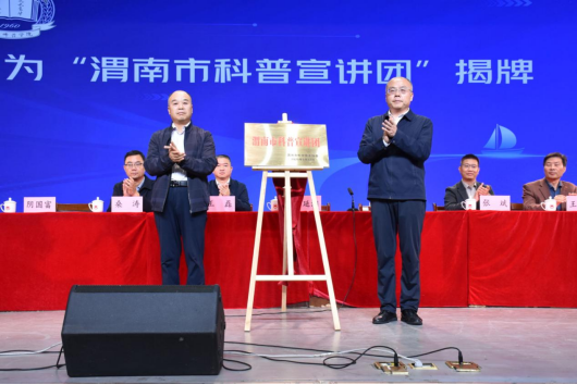 随后,渭南市科协党组书记王磊宣读了关于认定渭师科普宣讲团为“渭南市科普宣讲团”的批复文件。省科协副主席李延潮与副校长卢爱刚共同为宣讲团揭牌。