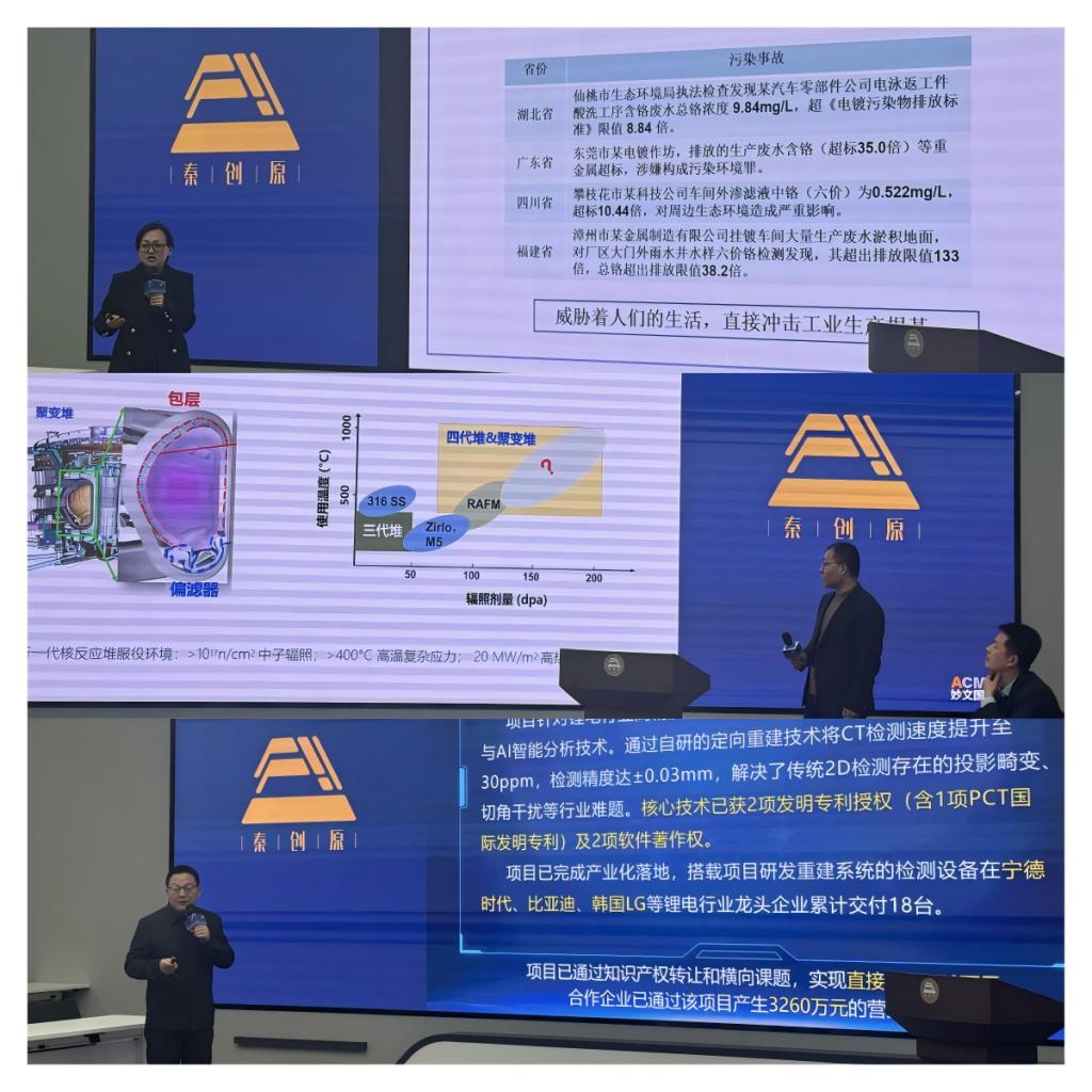 参与本次路演的项目包括:葛春平团队负责的“基于人工智能的锂离子电池快速CT重建系统”、李俊燕团队承担的“富氮型壳聚糖基Cr(VI)去除剂的研制”,以及张建宁团队开展的“快堆用铁素体合金氧化物界面元素偏析与核壳结构形成机理研究”。各团队在现场进行了系统汇报与成果展示,体现出较强的科研创新实力。