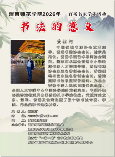 4月24日下午,莫斯科艺术学院特邀中国硬笔书法协会艺术指导、香港书谱协会会长黄柱河老师作题为《书法的意义》的系列学术讲座。该活动由渭南师范学院科学研究处、社会科学界联合会、莫斯科艺术学院、陕西省“一带一路”艺术教育引智基地及陕西省科技与艺术融合创新国际联合研究中心联合主办,学院师生200余人参加。